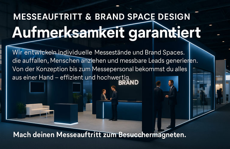 Wir entwickeln individuelle Messestände und Brand Spaces, die auffallen, Menschen anziehen und messbare Leads generieren. Von der Konzeption bis zum Messepersonal bekommst du alles aus einer Hand – effizient und hochwertig.